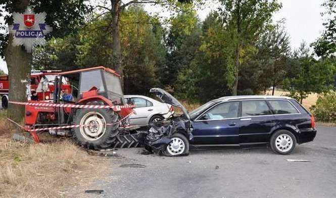 – Kierujący samochodem audi młody mężczyzna wyprzedzając motorower nie zachował odpowiedniego odstępu od jadącego przed nim forda, który skręcał w lewo i uderzył w jego bok. Następnie audi siłą rozpędu uderzyło w jadący z przeciwka ciągnik rolniczy. Wszystkie pojazdy zostały bardzo poważnie uszkodzone, a ruch na drodze zablokowany – relacjonuje Grzegorz Paśnik, rzecznik Komendy Powiatowej Policji w Lubartowie.