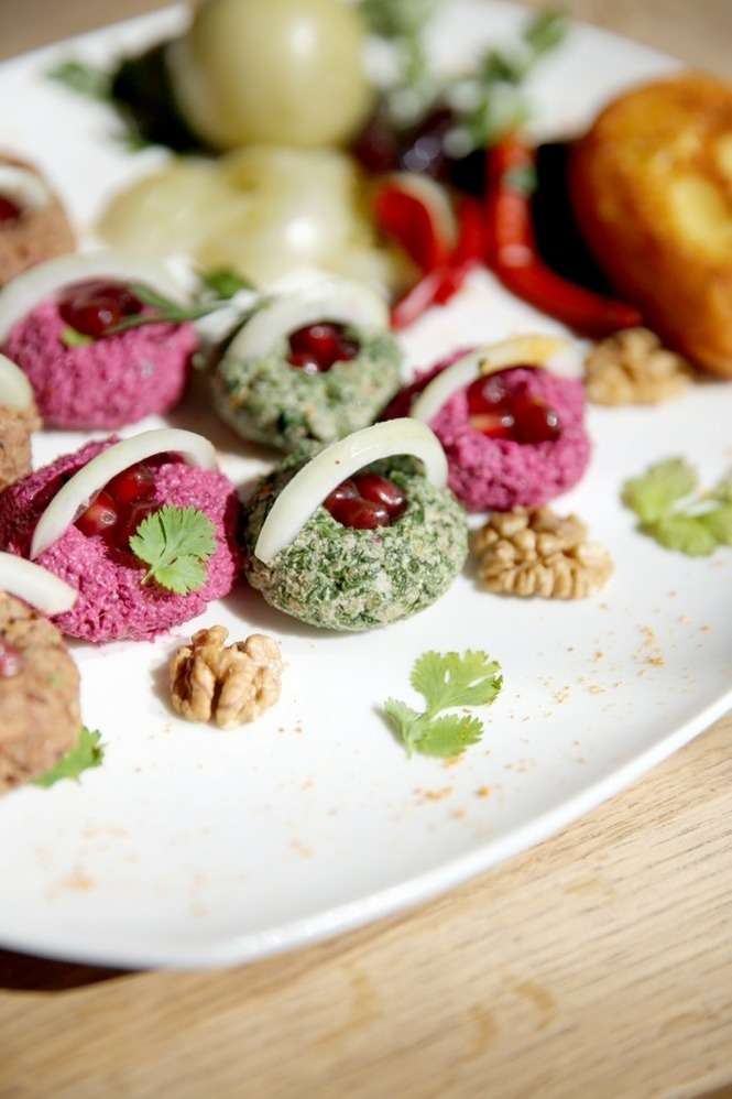 - Wyczarowaliśmy warzywne kulki phali zrobione z posiekanych liści buraków lub szpinaku, z dodatkiem pasty orzechowej, ziarnami granatu i przyprawami. W specjalnych placuszkach z mąki i sera - dodaje Elżbieta Cwalina z Hades Szeroka.