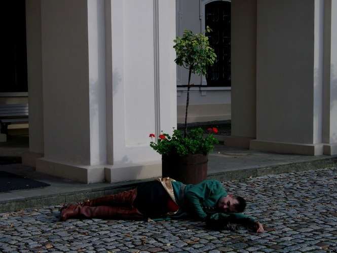 Pierwsza część wydarzenia nie zapowiadała niespodzianek. Zwykłe zdjęcia w pięknych wnętrzach współczesnych zakochanych młodych ludzi. Sytuacja zmieniła się, kiedy para, znużona zwiedzaniem, zapada w sen w jednej z pałacowych sal… Przenosimy się do obozu wojskowego, obserwujemy rapt panny młodej i próbę jej uwolnienia.