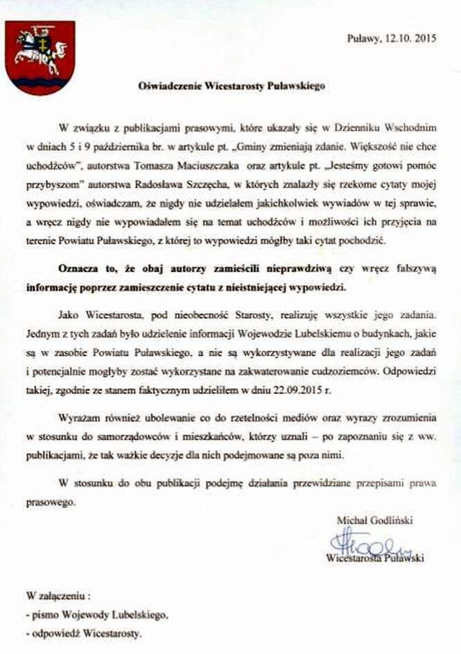 Tuż po publikacji artykułu "Jesteśmy gotowi pomóc przybyszom", który ukazał się na łamach tygodnika Teraz Puławy, będącego częścią piątkowego wydania Dziennika Wschodniego, na stronie internetowej Starostwa Powiatowego w Puławach pojawiło się oświadczenie wicestarosty. Michał Godliński twierdził w nim, że nigdy nie rozmawiał z Dziennikiem na temat sprawy uchodźców, a jego wypowiedź użyta w dwóch artykułach, wyżej wymienionym, jak również "Gminy zmieniają zdanie, większość nie chce uchodźców" na łamach Dziennika Wschodniego nigdy nie miała miejsca.