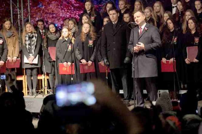 Za morze biało-czerwonych flag głowa państwa dziękowała kilkukrotnie podczas swojego przemówienia. A blisko 10-tysięczna widownia co chwilę nagradzała Dudę gromkimi brawami. „Andrzej Duda, Andrzej Duda…” skandowali zebrani, kiedy usłyszeli ze sceny, że prezydent pojawił się na Placu Wolności. Zanim jednak zaśpiewał tu kilka pieśni patriotycznych, odsłonił rondo I Brygady Komendanta Józefa Piłsudskiego.