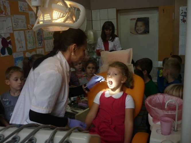 Pani doktor zachęciła do zwiedzenia gabinetu stomatologicznego, do którego udaliśmy się przy sąsiadującej szkole i zapoznała dzieci z wyposażeniem gabinetu stomatologicznego, sprzętem, urządzeniami i narzędziami dentystycznymi. Wyjaśniła jak się leczy zęby, pokazała dzieciom funkcjonowanie sprzętu medycznego. Dzieci były bardzo zaciekawione urządzeniami w gabinecie, zadawały mnóstwo pytań, na które otrzymywały wyczerpującą odpowiedź . Następną atrakcją była możliwość siedzenia na fotelu dentystycznym, który wcale nie był taki straszny, a "przejażdżka" w górę i w dół sprawiła dzieciom wielką frajdę. Pani doktor zachęcała dzieci do obserwacji swoich ząbków. Miła atmosfera zachęciła dzieci do odwiedzin i przełamała strach przed dentystą i wszelkimi urządzeniami znajdującymi się w gabinecie.