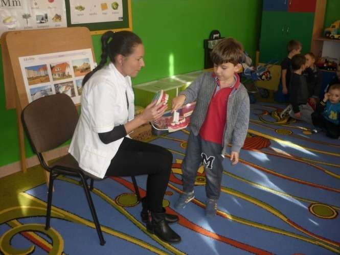 W ramach działań profilaktycznych w naszym przedszkolu w dniu 13 listopada br., dzieci z grupy VI, VII i VIII odwiedziła pani stomatolog Agnieszka Kozak. Pani doktor powitała nas bardzo serdecznie, a następnie przeprowadziła krótką pogawędkę o prawidłowym myciu zębów oraz zasad właściwego odżywiania się.