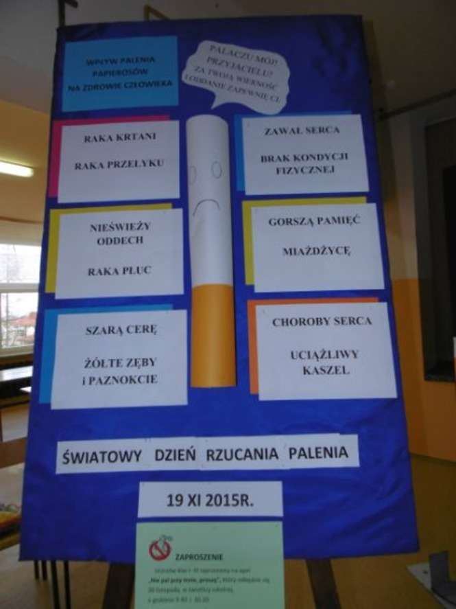 Uczniowie klasy trzeciej zaprezentowali rówieśnikom trzy scenki mówiące o szkodliwości palenia papierosów. Apelowali w nich do rodziców i dziadków, aby nie palili przy dzieciach. Na zakończenie spotkania wszystkie dzieci malowały znaki „zakazu palenia”, które mają za zadanie przypominać rodzicom i innym dorosłym, że w obecności dziecka się nie pali. Pokolorowane znaki z napisem "Nie pal przy mnie, proszę" dzieci zabrały do domu, by powiesić je w widocznym dla rodziców miejscu.