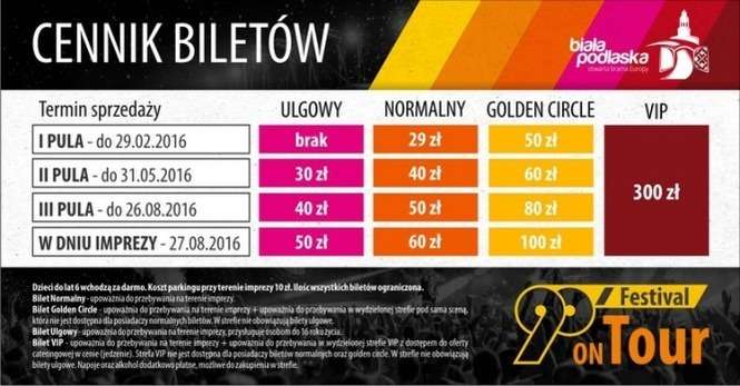 Po 29 lutego bilet normalny będzie już kosztował 40 zł, po 31 maja – 50 zł. A w dniu imprezy, czyli 27 sierpnia trzeba będzie zapłacić 60 zł.