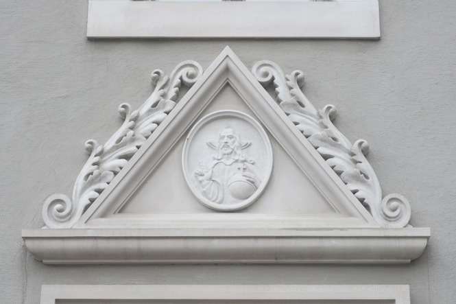 Natomiast na Mansjonarii znaleźć można medalion z płaskorzeźbą Chrystusa. To też pamiątka po farze, bo przeniesiono go z rozbieranych murów świątyni.