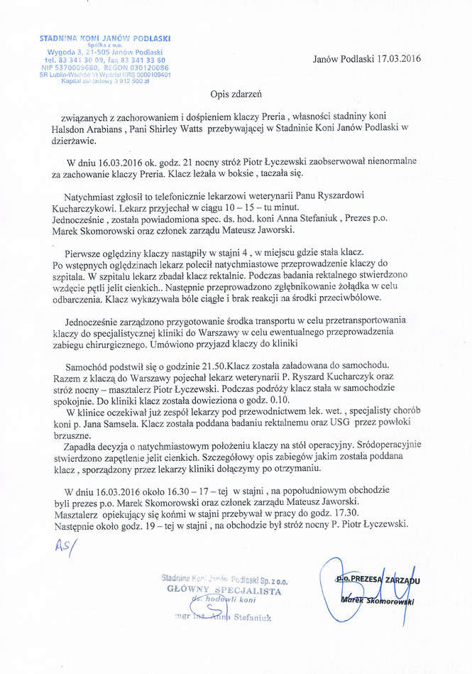 O zdarzeniu poinformowana została też prokuratura. Przypomnijmy, że od 15 marca w zarządzie janowskiej stadniny zasiada nowy członek – Mateusz Leniewicz-Jaworski. Zajmuje się nadzorem nad hodowlą oraz promocją stadniny i koni.