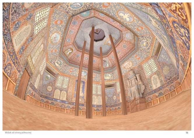 Projekt wystroju wnętrza jest bardzo bogaty. Sklepienie synagogi dzieli się na cztery poziomy. Na pierwszym poziomie w narożnych polach umieszczone zostaną zwierzęta miszny: lew, lampart, jeleń i orzeł. Po stronie wschodniej pojawi się widok na Jerozolime. Na południowej będzie orzeł dwugłowy - symbol opieki nad narodem Izraela; na północy Lewiatan, a od zachodu instrumenty wiszące na wierzbach. Na poziomie drugim znajdą się znaki zodiaku. Na trzecim m.in. plecionka roślinna i zwierzęta. Na czwartym poziomie kopuły pokryją złote gwiazdy na ciemnoniebieskim tle.