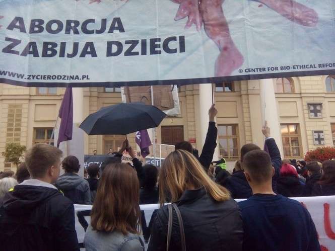 Na dzisiejszym proteście pojawili się także zwolennicy zaostrzenia prawa aborcyjnego. Przynieśli transparenty z hasłem „Aborcja zabija dzieci” ze zdjęciem zakrwawionego płodu. Organizatorzy pikiety starali się je zasłonić flagami partii Razem i czarnymi parasolkami. Okrzyki „Stop aborcji” były natychmiast zagłuszane przez ubranych na czarno uczestników pikiety.
