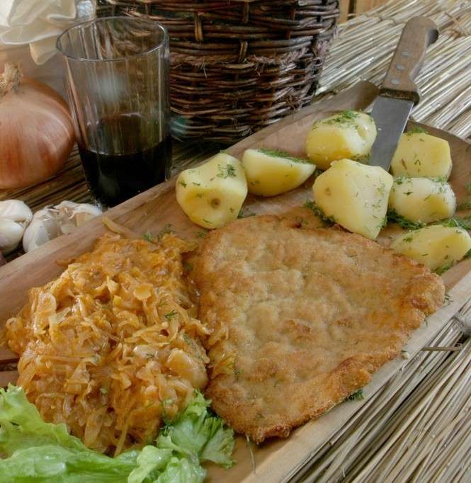 Składniki: 60 dag schabu, 15 dag masła, 1 łyżka majeranku, 4 ząbki czosnku, sól, pieprz, bułka, 2 jajka, olej.