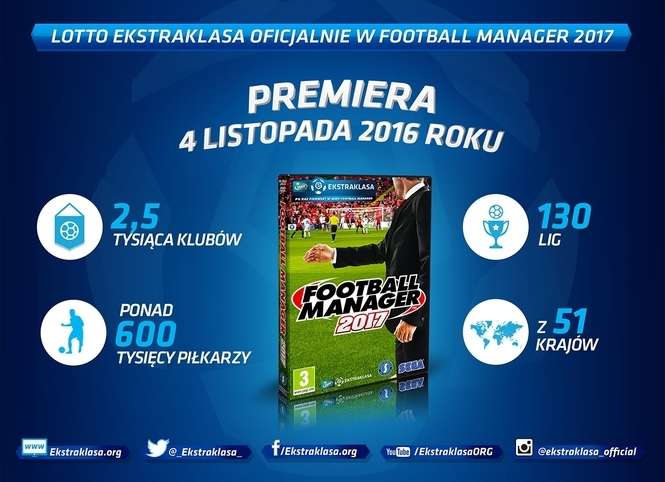 - Z każdą kolejną edycją staramy się, żeby gra Football Manager była tak autentyczna i realistyczna, jak to tylko możliwe. Dodanie oficjalnych elementów związanych z Lotto Ekstraklasą do Football Manager 2017 to ważny krok do przodu w naszych dążeniach. Jesteśmy zachwyceni wsparciem, jakie dostaliśmy od wszystkich związanych z Lotto Ekstraklasą i liczymy na długie oraz owocne partnerstwo - dodaje Miles Jacobson, Director of Football Manager.