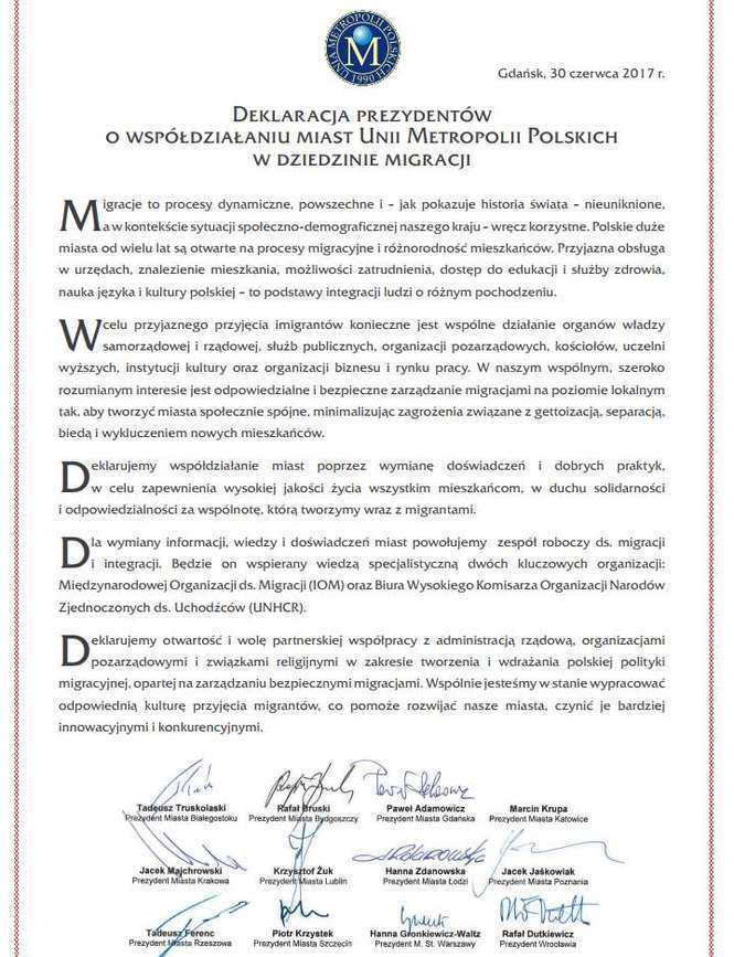 Deklarujemy otwartość i wolę partnerskiej współpracy z administracją rządową, organizacjami pozarządowymi i związkami religijnymi w zakresie tworzenia i wdrażania polskiej polityki migracyjnej, opartej na zarządzaniu bezpiecznymi migracjami. Wspólnie jesteśmy w stanie wypracować odpowiednią kulturę przyjęcia migrantów, co pomoże rozwijać nasze miasta, czynić je bardziej innowacyjnymi i konkurencyjnymi.