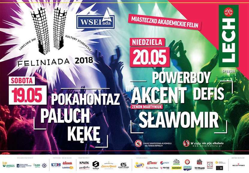 Studenckie koncerty na Felin wracają po kilku latach przerwy. To już niemal tradycja, że na Feliniadzie nie zabraknie rytmów disco polo. W niedzielę wystąpią niekwestionowane gwiazdy tego gatunku: Akcent z Zenonem Martyniukiem i Sławomir. W sobotę na scenie wystąpią artyści hip-hopowi. Przedstawiciele tego nurtu muzycznego pojawią się także na Kozienaliach, ale ich występy zaplanowano na piątek.