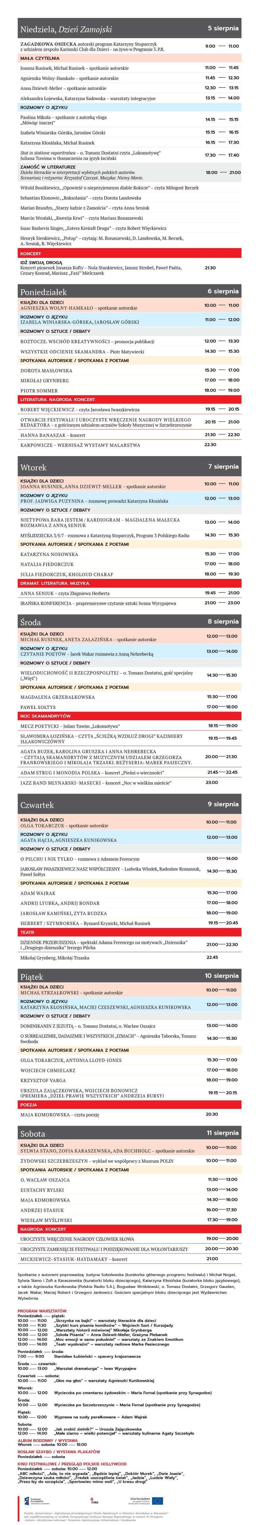 W kolejne dni (festiwal trwa tydzień – do 11 sierpnia) – już w Szczebrzeszynie – warsztaty (dla dzieci i dorosłych), debaty o sztuce i spotkania autorskie. Będą też koncerty (Hanna Banaszak, Haydamaky, Młynarski Masecki), wystawy, ale także wycieczki (po cmentarzu żydowskim i po Szczebrzeszynie), wyprawy na susły (z Adamem Wajrakiem), festiwalowy spływ kajakami czy przegląd polskiego kina.