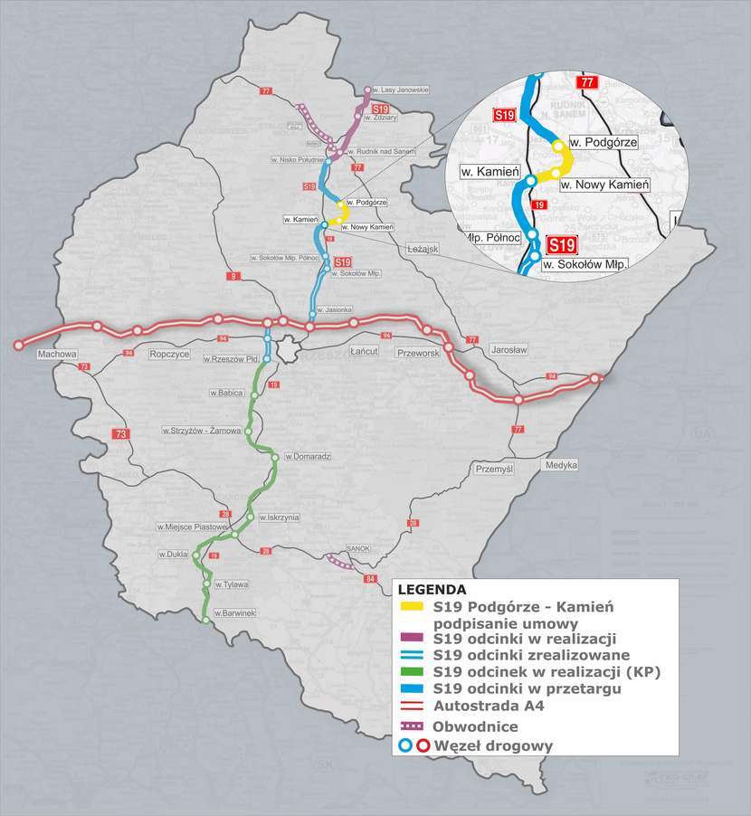 Chodzi o 10,5-kilometrowy fragment trasy na Podkarpaciu, od węzła Podgórze (z węzłem) do węzła Kamień (bez węzła). Trasę zbuduje w ciągu 34 miesięcy Budimex. Koszt to 333,5 mln zł brutto.