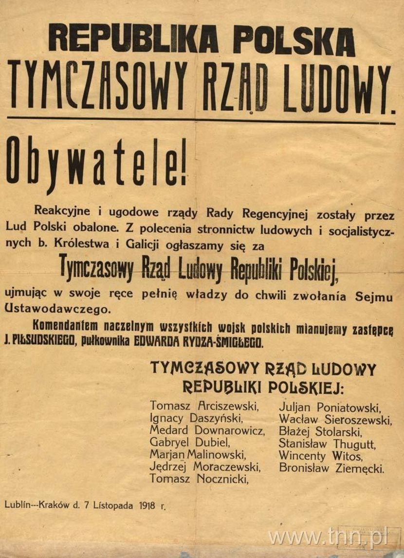 – 11 listopada Józef Piłsudski przyjmował w Warszawie Ignacego Daszyńskiego i Edwarda Rydza-Śmigłego, który był odpowiednikiem dzisiejszego ministra obrony narodowej, ale powierzył Daszyńskiemu misję tworzenia rządu. Kiedy to się nie powiodło, rząd stworzył Jędrzej Moraczewski, ale pod tą samą nazwą i w większości z tymi samymi ministrami. Mówi się, że „rząd lubelski” istniał trzy dni, do wyjazdu Daszyńskiego i Rydza-Śmigłego. Ale w rzeczywistości, do powstania rządu Moraczewskiego, funkcjonował pod kierownictwem wicepremiera i ministra spraw wewnętrznych Stanisława Thugutta. Dowodem tego są dwa dekrety z 17 listopada, dotyczące wprowadzenia ośmiogodzinnego dnia pracy i minimalnych warunków służbowych dla służby folwarcznej. W programie rządu Daszyńskiego zostały sformułowane zasady ustrojowe, które później przyjęła II Rzeczpospolita w Konstytucji Marcowej.