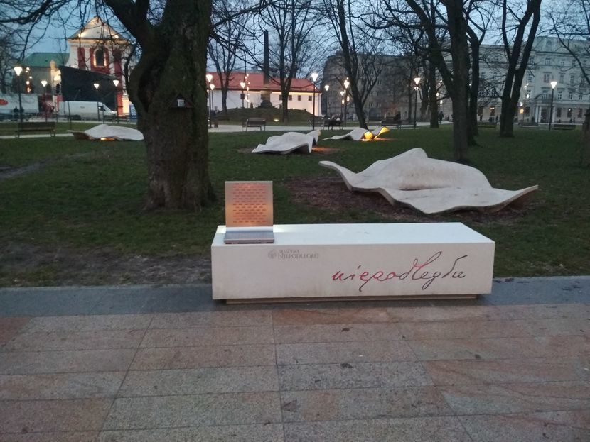 W Lublinie taka ławka stanęła na pl. Litewskim, na przeciwko pałacu Lubomirskich. Siedząc można posłuchać pieśni "My, Pierwsza Brygada", czy też depeszę marszałka Józefa Piłsudskiego, w której ogłosił powstanie niepodległego państwa polskiego.