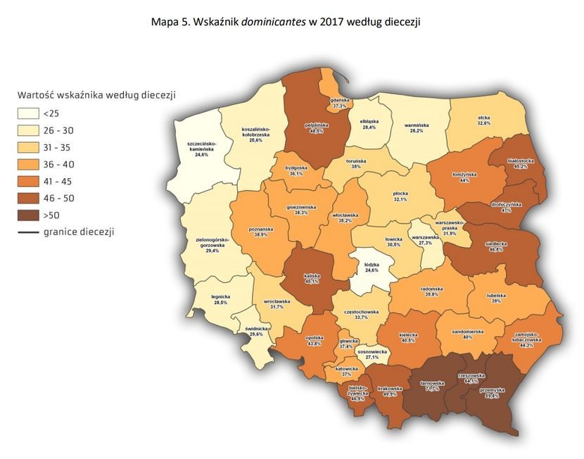 * diecezja zamojsko-lubaczowska – 44,3 proc. i 22,5 proc. (2017 r.), 41,5 proc. i 20,1, proc. (2016 r.), 45,2 proc. i 22 proc. (2015 r.)