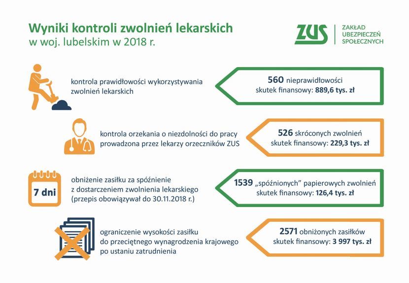 W województwie lubelskim ZUS stwierdził takie nieprawidłowości w przypadku 560 zwolnień – co dziesiątego ze skontrolowanych.