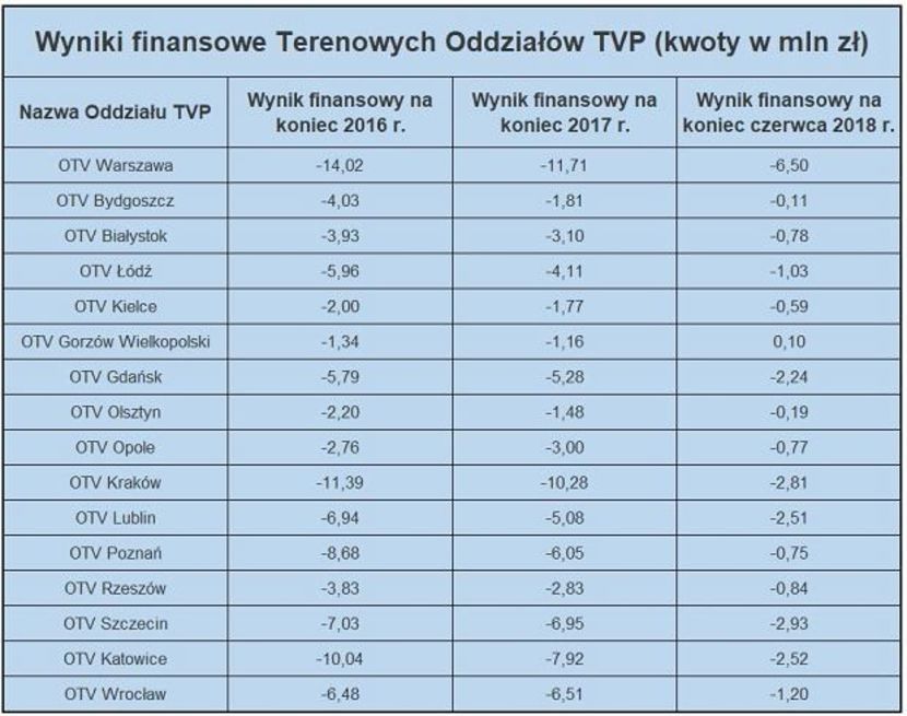 Jak już pisaliśmy, lubelski oddział publicznej telewizji pod względem finansowym od 2016 roku jest na minusie: w 2016 roku było to 6,94 mln zł straty, w 2017 r. – 5,08 mln zł straty, a wynik finansowy na koniec czerwca 2018 roku wyniósł 2,51 mln zł straty.