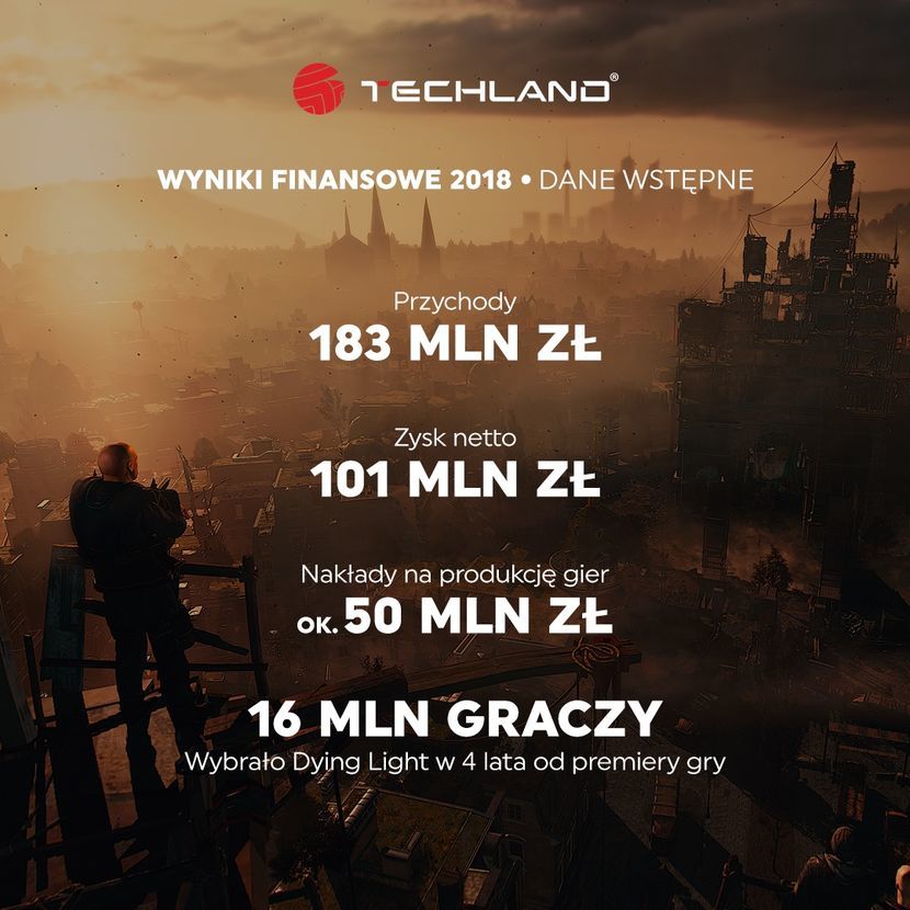 - Nakłady na produkcję nowych gier Techlandu w 2018 roku sięgnęły ok. 50 mln zł. Równolegle rozwijamy dwa projekty klasy AAA, nad którym pracują zespoły w naszych biurach w Warszawie i we Wrocławiu. Łącznie to już ponad 400 osób - dodaje Karol Bach, CFO Techlandu.