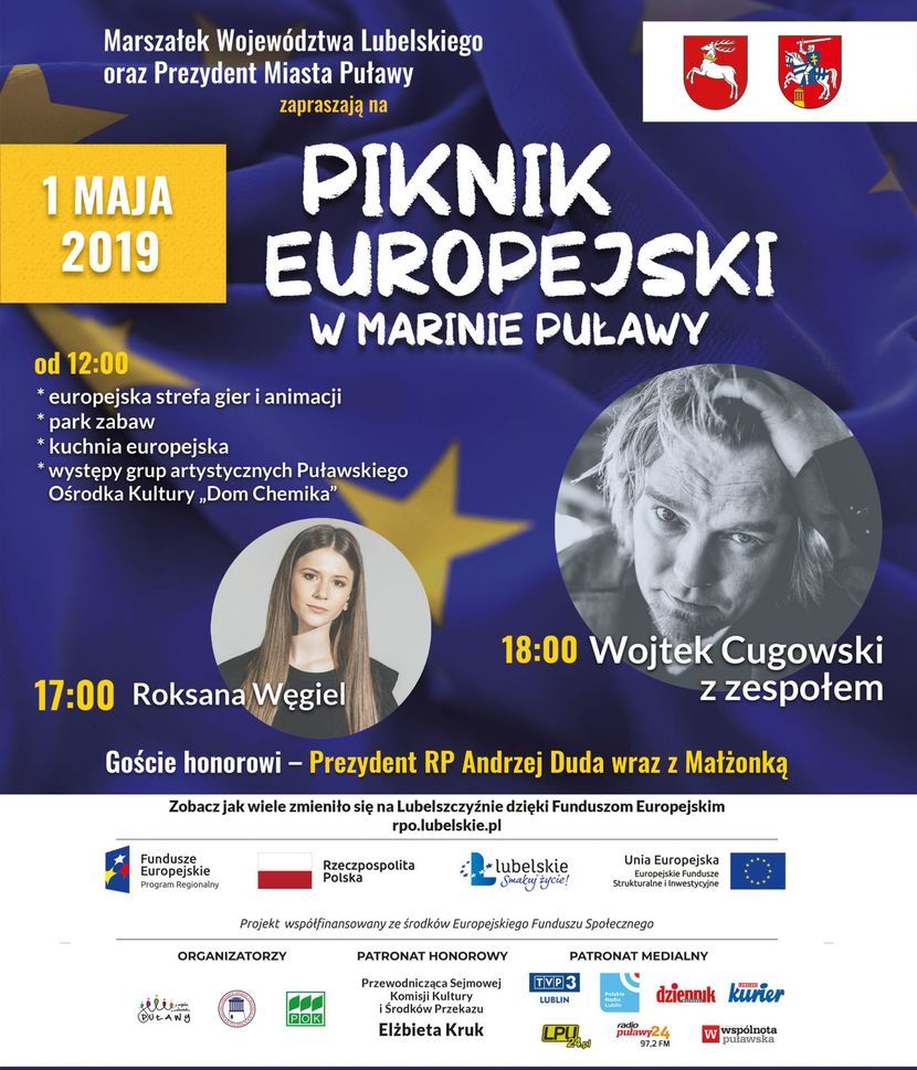 Piknik Europejski rozpocznie się o godzinie 12. Zostanie zorganizowana strefa gier i zabaw dla dzieci, liczne konkursy z nagrodami, animacje i strefa dmuchanych atrakcji oraz wyjątkowa kuchnia europejska. Ponadto mobilne punkty informacyjne dot. funduszy europejskich oraz stoiska promocyjne. Na muzycznej scenie wystąpią lokalni artyści z Puławskiego Ośrodka Kultury „Dom Chemika”, Zespół Pieśni i Tańca „Powiśle”, Kapela Ludowa, Zespół Baletowy „Etiuda”, a także młodzi wokaliści – podopieczni Mariusza Przybysia, Zbigniewa Jonaka i Michała Matrasa.