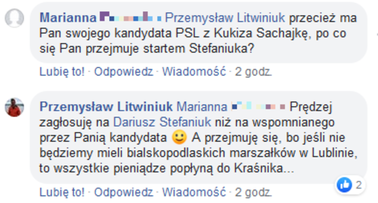 Kandydaturę krytykuje Przemysław Litwiniuk, wpływowa postać w środowisku ludowców. „Prędzej zagłosuję na Dariusza Stefaniuka, niż na wspomnianego przez panią kandydata. A przejmuję się, bo jeśli nie będziemy mieli bialskopodlaskich marszałków w Lublinie, to wszystkie pieniądze popłyną do Kraśnika... (z tego miasta pochodzi marszałek Jarosław Stawiarski – dop. red.)” – napisał na facebookowym fanpage’u Dariusza Stefaniuka, odnosząc się do wypowiedzi jednej z internautek, która pytała zdziwiona: „Po co się Pan przejmuje startem Stefaniuka”.