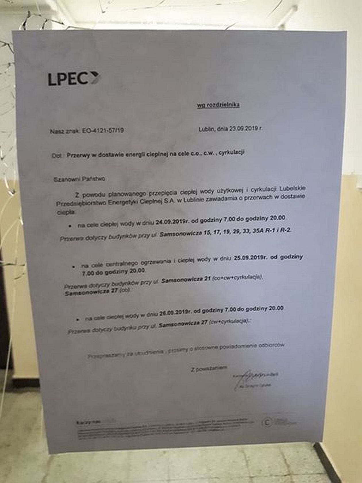Spółka zapowiada, że we wtorek ciepłej wody w kranach nie będą mieć lokatorzy bloków przy Samsonowicza 15, 17, 19, 29, 33 i 35a, w środę bez ciepłej wody i centralnego ogrzewania będą musieli sobie poradzić mieszkańcy bloku przy Samsonowicza 21. Z kolei w budynku przy Samsonowicza 27 w środę nie będzie ogrzewania, a w czwartek ciepłej wody.
