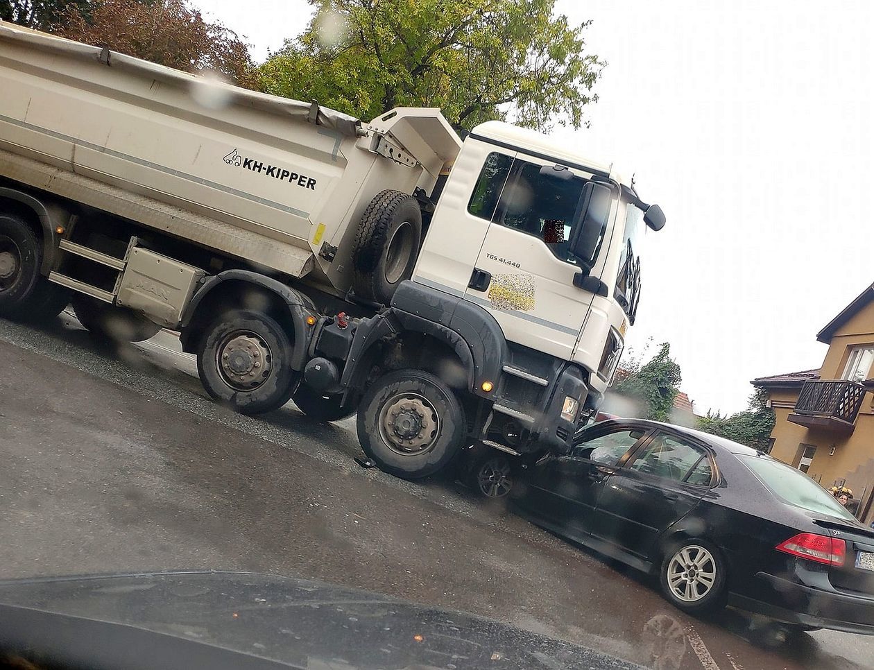 Do kolizji doszło na ul. Lubelskiej. Były spore utrudnienia w ruchu, bo saab utknął pod ciężarówką. Pojazdy blokowały ulicę.