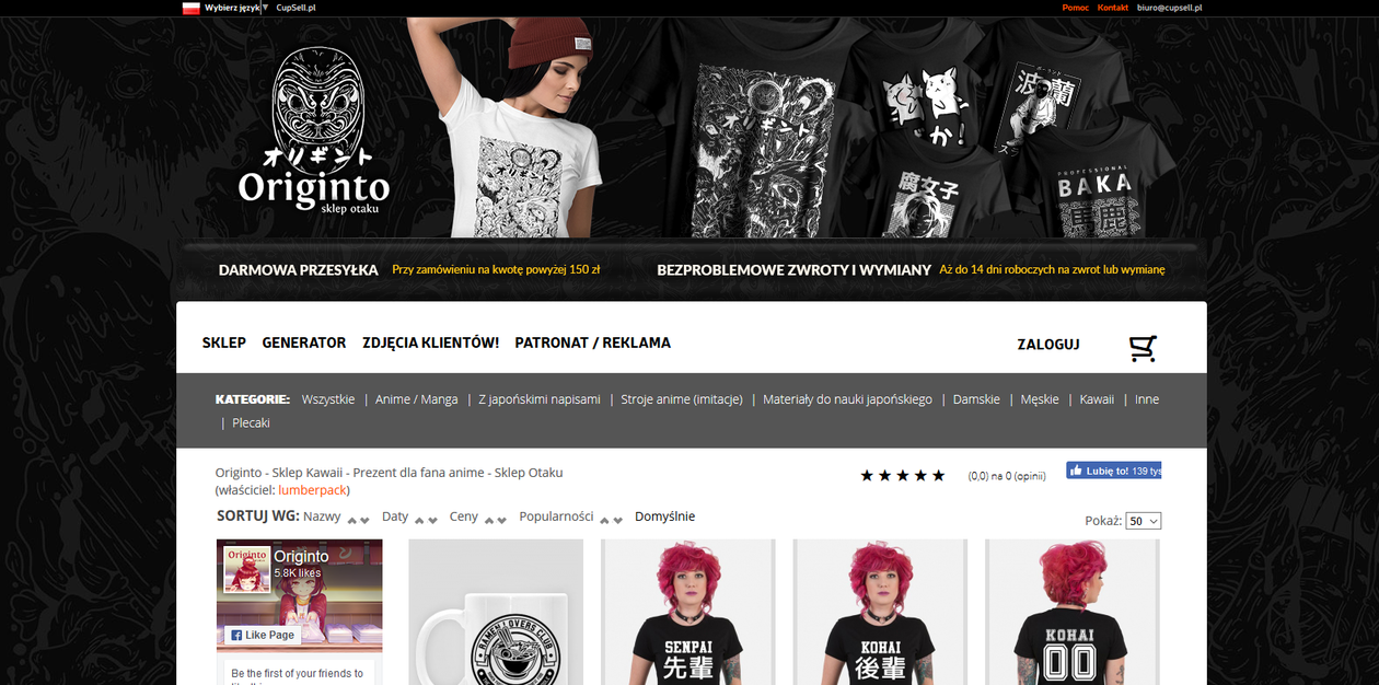 o originto.cupsell.pl – ubrania oraz różnorodne akcesoria dla otaku z darmową dostawą od 150 zł (aktualnie trwa promocja na dostawę już od 99 zł - bez określonego terminu ważności). Sklep z pewnością przypadnie do gustu miłośnikom japońskiej mody w stylu harajuku. Uwaga: kupujący ma możliwość wgrania grafiki własnego projektu!