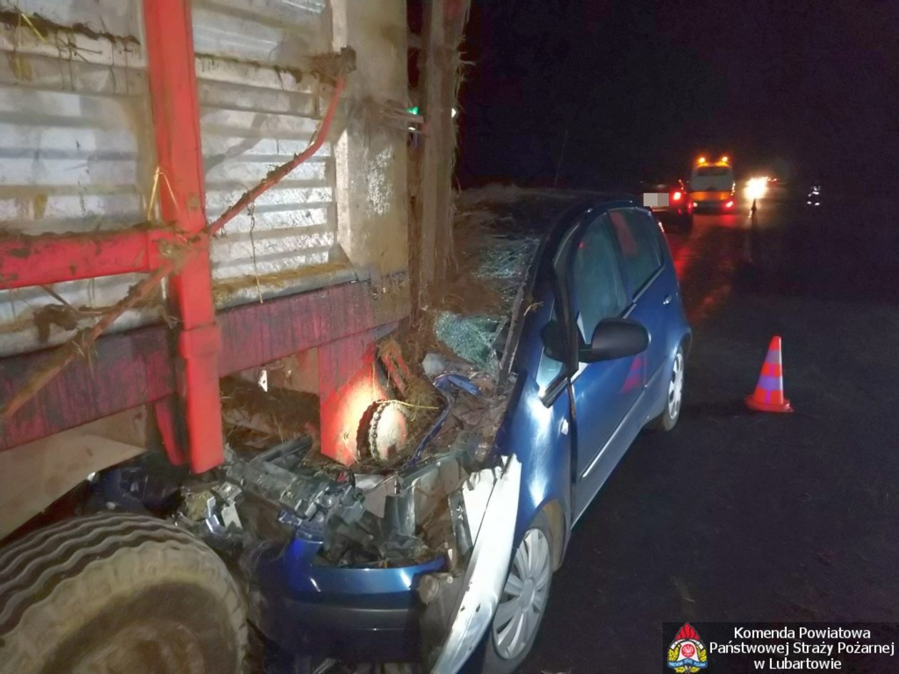 W środę na drodze powiatowej kierowca osobowego mitsubishi najechał na tył ciągnika rolniczego CASE ciągnącego rozrzutnik z obornikiem.