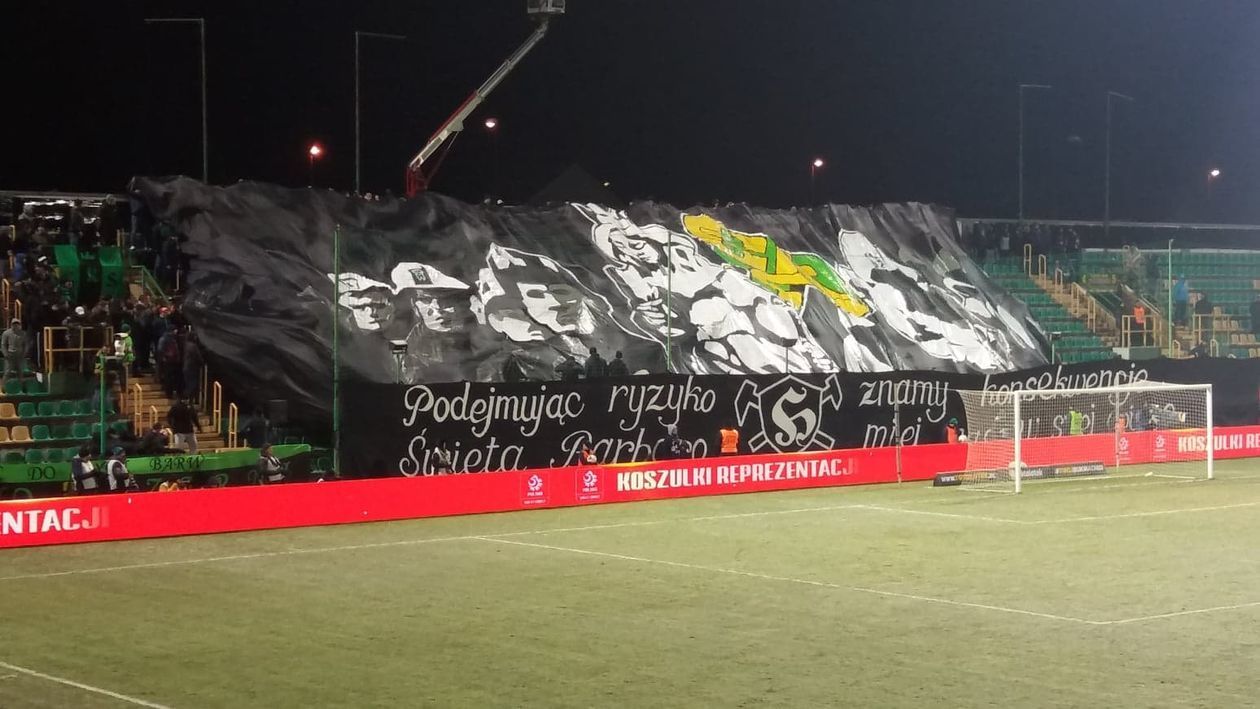 68 min. Kibice Górnika zaprezentowali właśnie efektowną oprawę nawiązującą do jutrzejszego święta "Barbórki". Fani wywieslili flagę z napisem "Podejmując ryzyko, znamy konsekwencje. Święta Barbaro, miej nas w swej opiece".