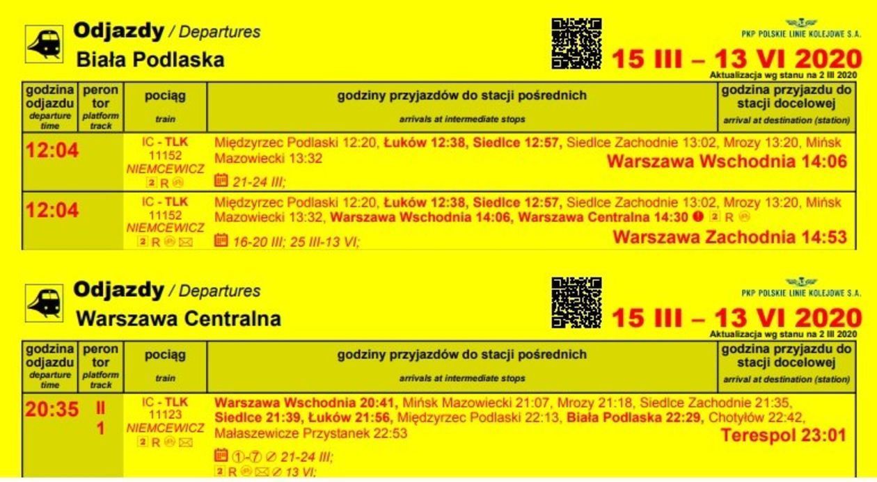 – W związku z dużą liczbą podróżnych pociągi są często przepełnione, a pasażerowie muszą stać na korytarzach wagonów – dodaje. Na ten problem zwracali nam uwagę również czytelnicy. Spiętrzenie następuje zwykle przy okazji przerw świątecznych. – Nie zgadzamy się na takie wykluczenie komunikacyjne – podkreśla koordynator Bezpartyjnych Samorządowców. Jego zdaniem, spółka kolejowa dostrzegła interwencje stowarzyszenia. Dodatkowe połączenie pociągu TLK Niemcewicz planowane jest o 12.04 z Białej Podlaskiej do Warszawy Centralnej, a w drodze powrotnej z Warszawy Centralnej pociąg wyruszy o 20:35.