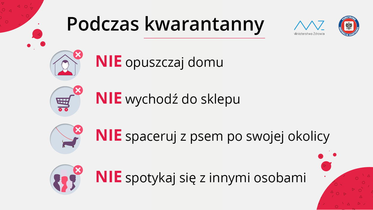 Informacja, że ktoś jest objęty kwarantanną dotyczy osób zdrowych, które miały bliski kontakt z osobami zakażonymi lub podejrzanymi o zakażenie koronawirusem. Osoba nią objęta przebywa w swoim mieszkaniu przez dwa tygodnie – liczone od dnia ostatniego kontaktu z zakażonym lub od dnia powrotu z regionu ryzyka. Nie wolno jej wychodzić, nawet z psem na spacer, do sklepu czy do lekarza. To kwestia odpowiedzialności, bo może być nosicielem koronawirusa i zakażać, choć sama nie ma objawów. Nikomu nie wolno takiej osoby odwiedzać.