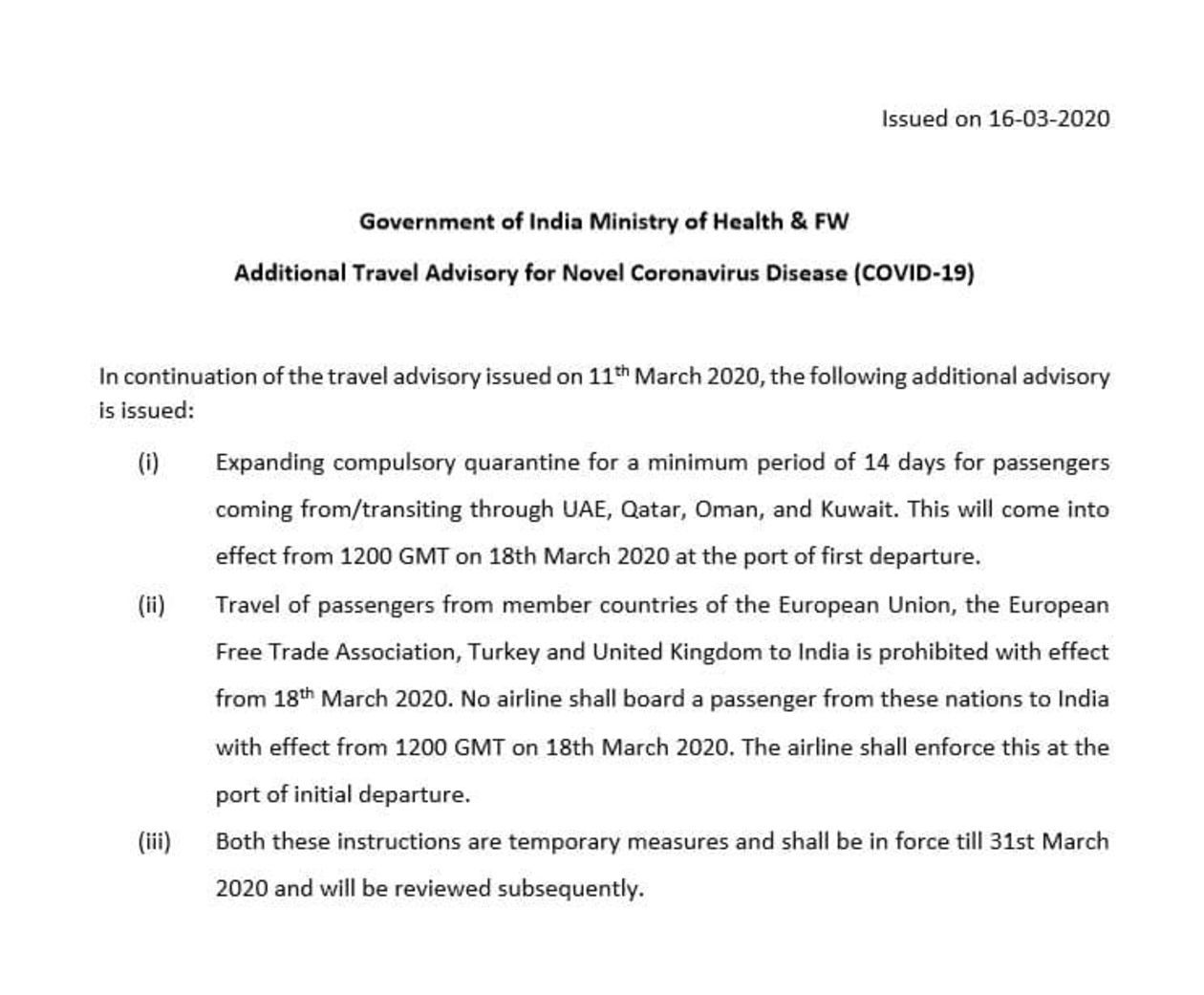 Z decyzji indyjskiego rządu (datowanej na 16 marca 2020) wynika, że podróżni z krajów Unii Europejskiej, Turcji i Wielkiej Brytanii nie będą mogli wjechać do Indii 18 marca 2020 r. od godz. 12 GMT (to godz. 13 czasu polskiego, 17.30 czasu indyjskiego). Zakaz obowiązuje do 30 marca z możliwością przedłużenia.