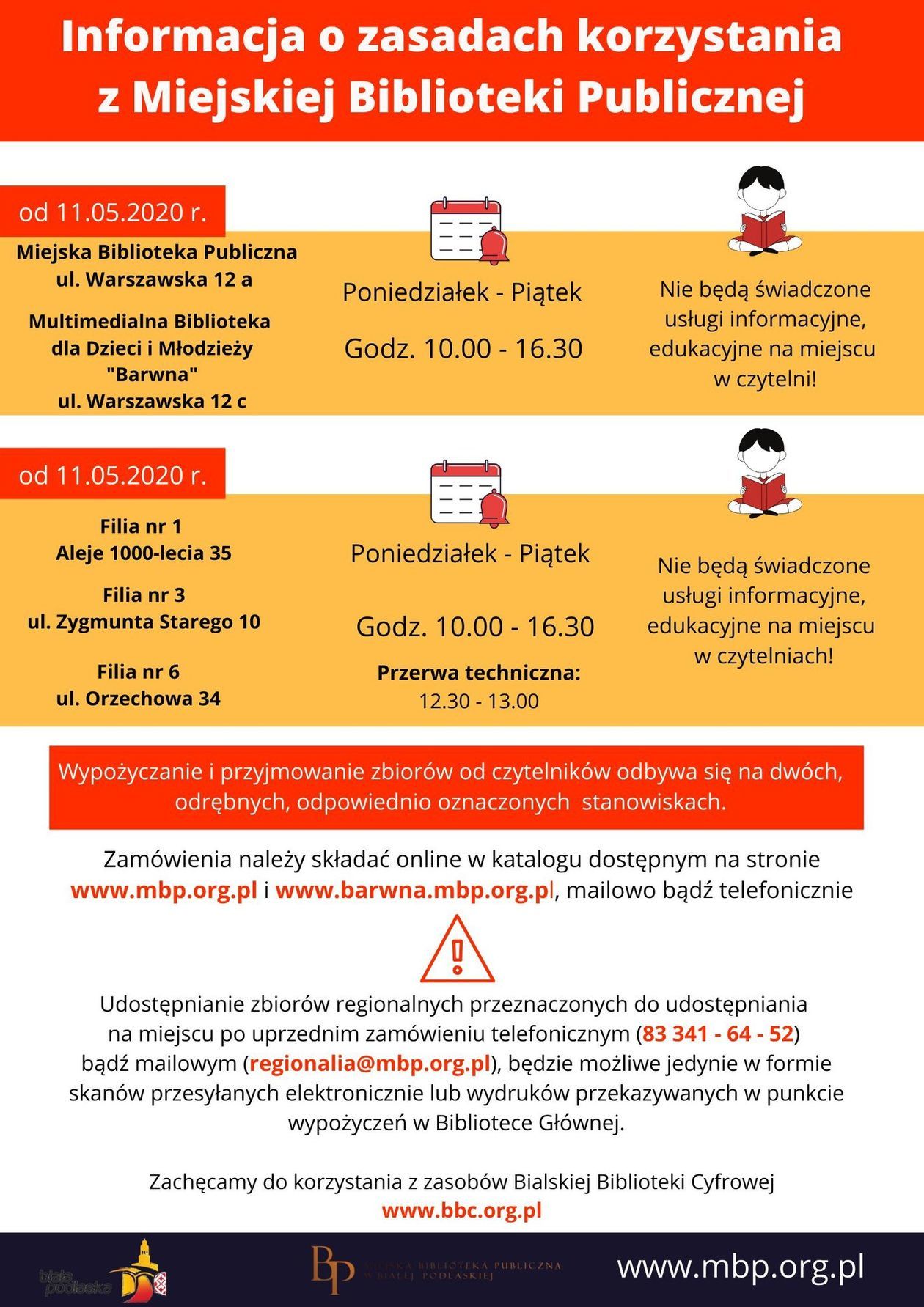 Biblioteka będzie czynna od poniedziałku do piątku, w godzinach od 10.00 do 16.30. Wypożyczanie i przyjmowanie książek odbywa się w dwóch odrębnych stanowiskach.
