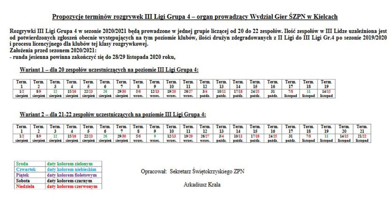 Dlatego Świętokrzyski Związek Piłki Nożnej przygotował dwa warianty terminarza. Pierwszy z nich przygotowany został dla 20 klubów. Wówczas liga wystartuje 1 sierpnia. W tym miesiącu piłkarzy czeka mnóstwo grania, bo zaplanowano aż siedem kolejek. Poza weekendami mecze będą się odbywały w dwie środy: 12 i 26 sierpnia. W 2020 roku ma się odbyć 19 kolejek, a jeszcze jedna z nich będzie rozegrana w środku tygodnia – 11 listopada. Ostatnia seria gier odbędzie się w weekend 14 i 15 listopada. Bezwzględnie rozgrywki mają się zakończyć do 29 listopada.