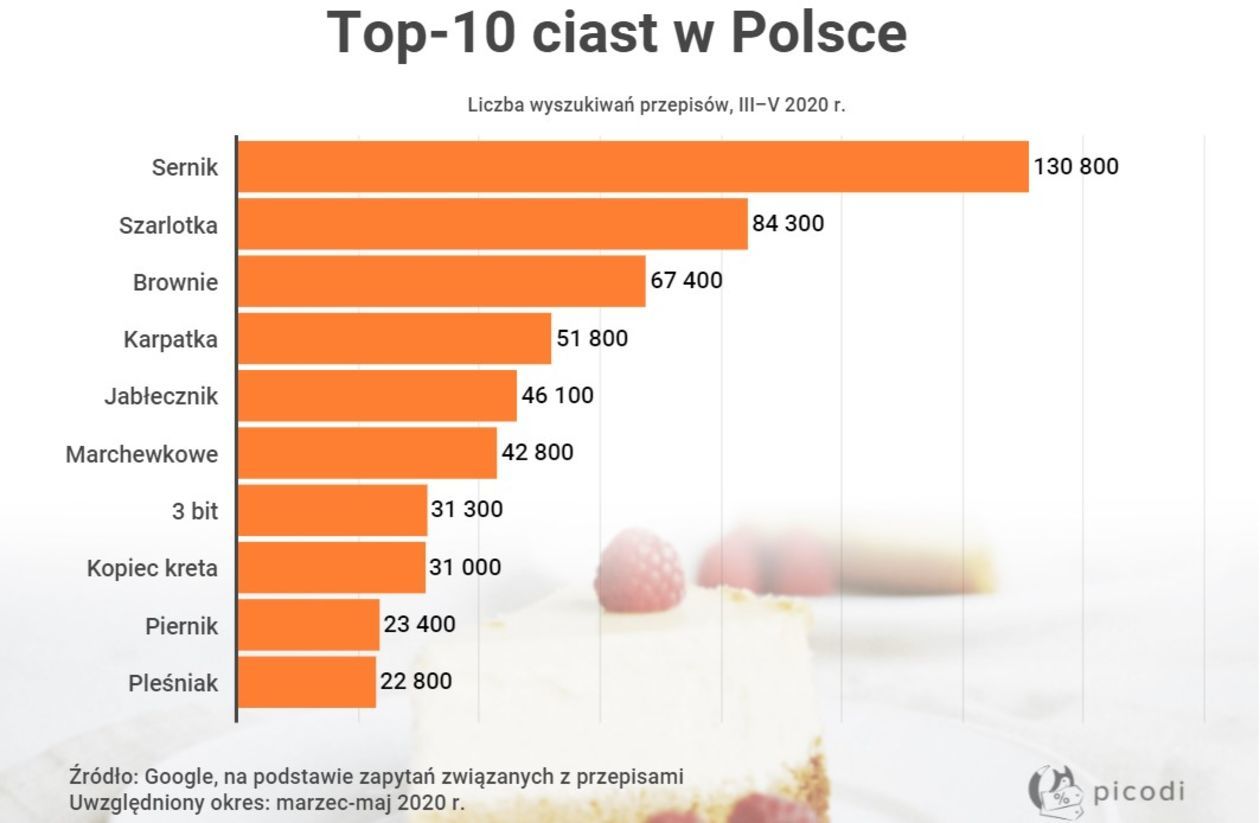 Zespół analityków Picodi.com przygotował ogólnopolski i lokalny ranking najpopularniejszych ciast. W całej Polsce to kolejno: