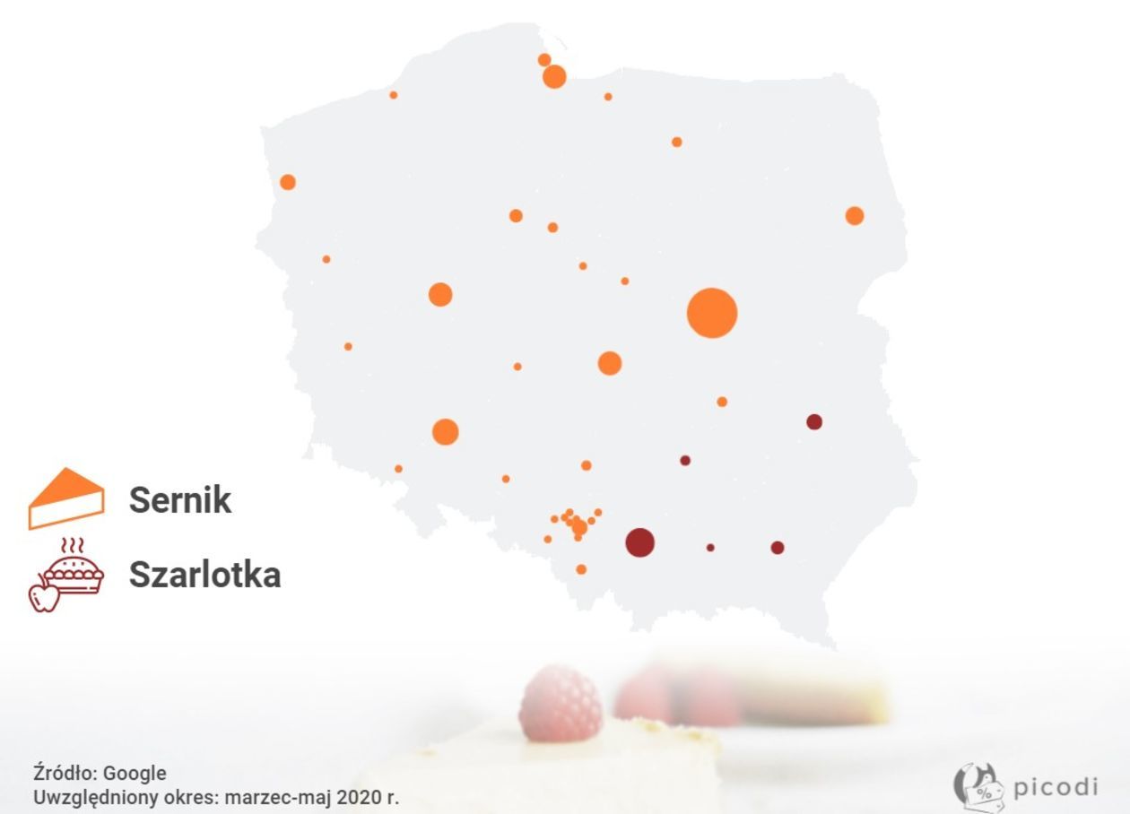 Sprawdzono też, jakie ciasta są najczęściej pieczone w miastach powyżej 100 tys. mieszkańców. Okazało się, że sernik wiedzie prym w większości dużych miast. Wyjątek na tej mapie Polski to południowy wschód: Kielce, Lublin, Kraków, Tarnów i Rzeszów – w tych miastach najczęściej piecze się szarlotkę.