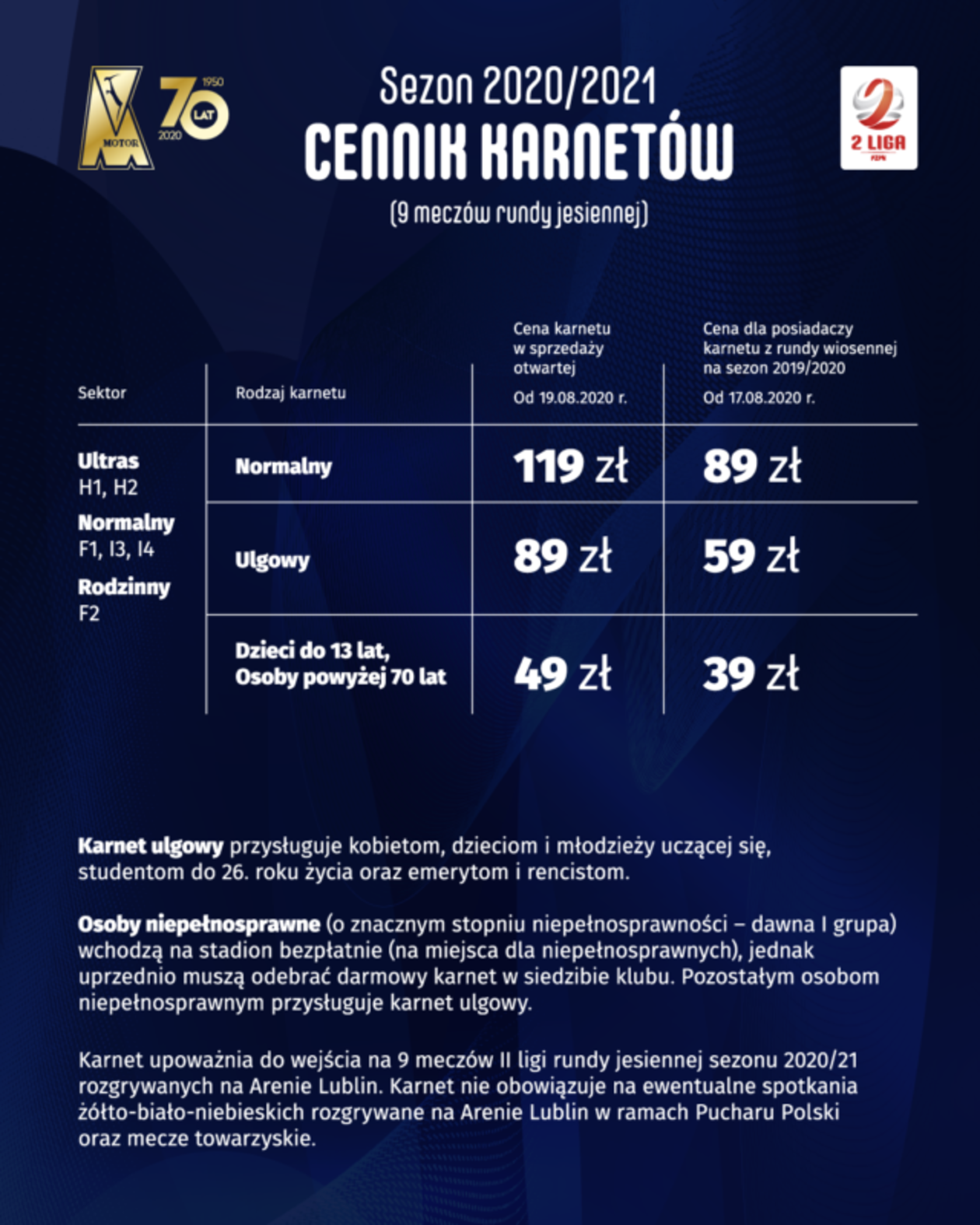 Kto może kupić karnet ulgowy? Kobiety, dzieci i młodzież ucząca się do 26. roku życia oraz emeryci i renciści. Z okazji 70-lecia istnienia Motoru wszyscy kibice urodzeni w 1950 roku mogą odbierać w siedzibie klubu darmowe karnety. Wystarczy wziąć ze sobą jedynie dowód tożsamości. Pytania odnośnie karnetów można zadawać drogą mailową na adres: [email protected].