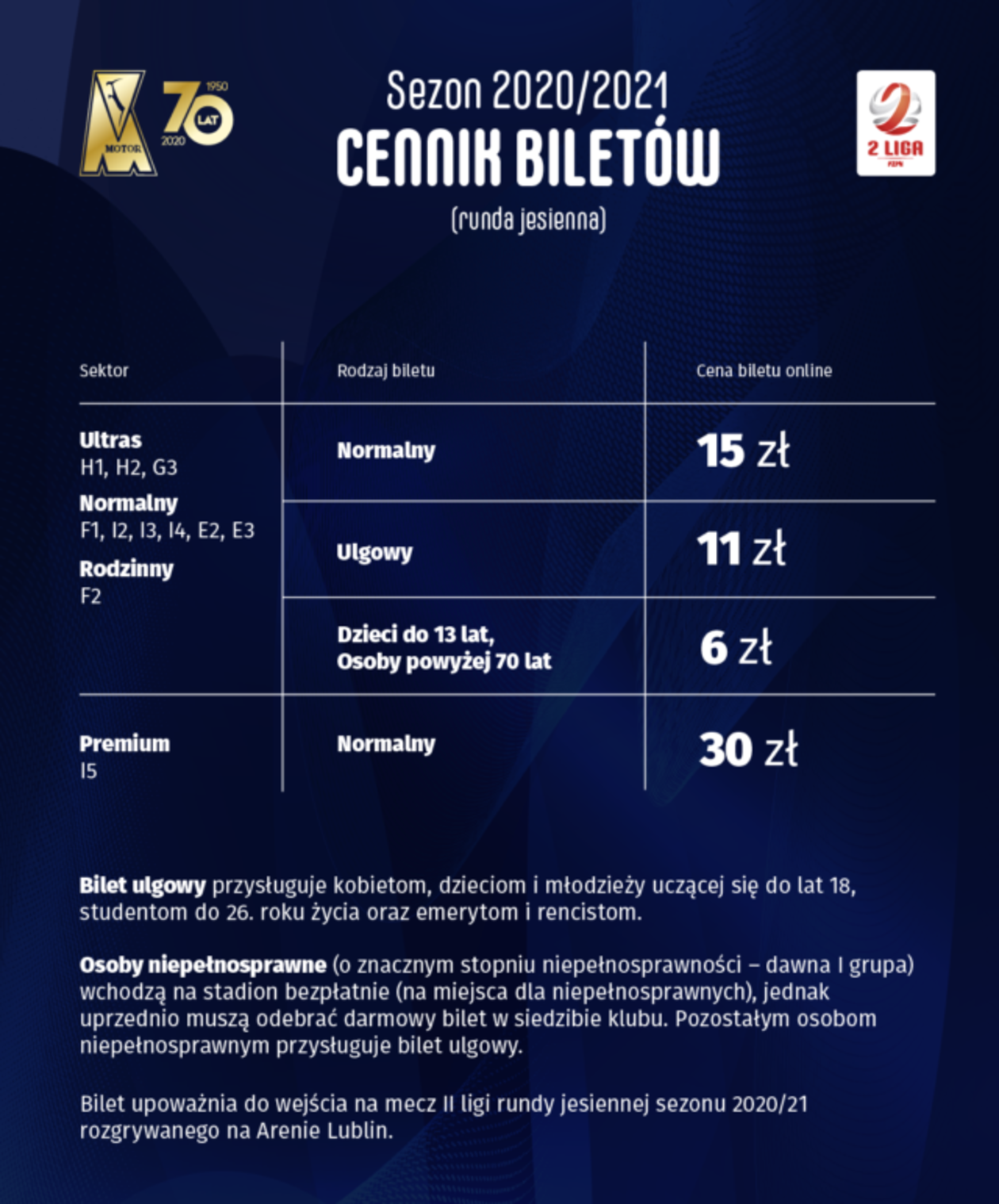 Dzieci do lat 13 i osoby powyżej 70 roku życia wejdą na stadion za 6 zł. Na sektorze I5 będą obowiązywały bilety premium – za 30 zł. Wejście na stadion dla osób niepełnosprawnych (o znacznym stopniu niepełnosprawności – dawna I grupa) jest bezpłatne. Wcześniej trzeba jednak odebrać darmowy bilet w siedzibie klubu na Arenie Lublin. Pozostałym osobom niepełnosprawnym przysługują wejściówki ulgowe.