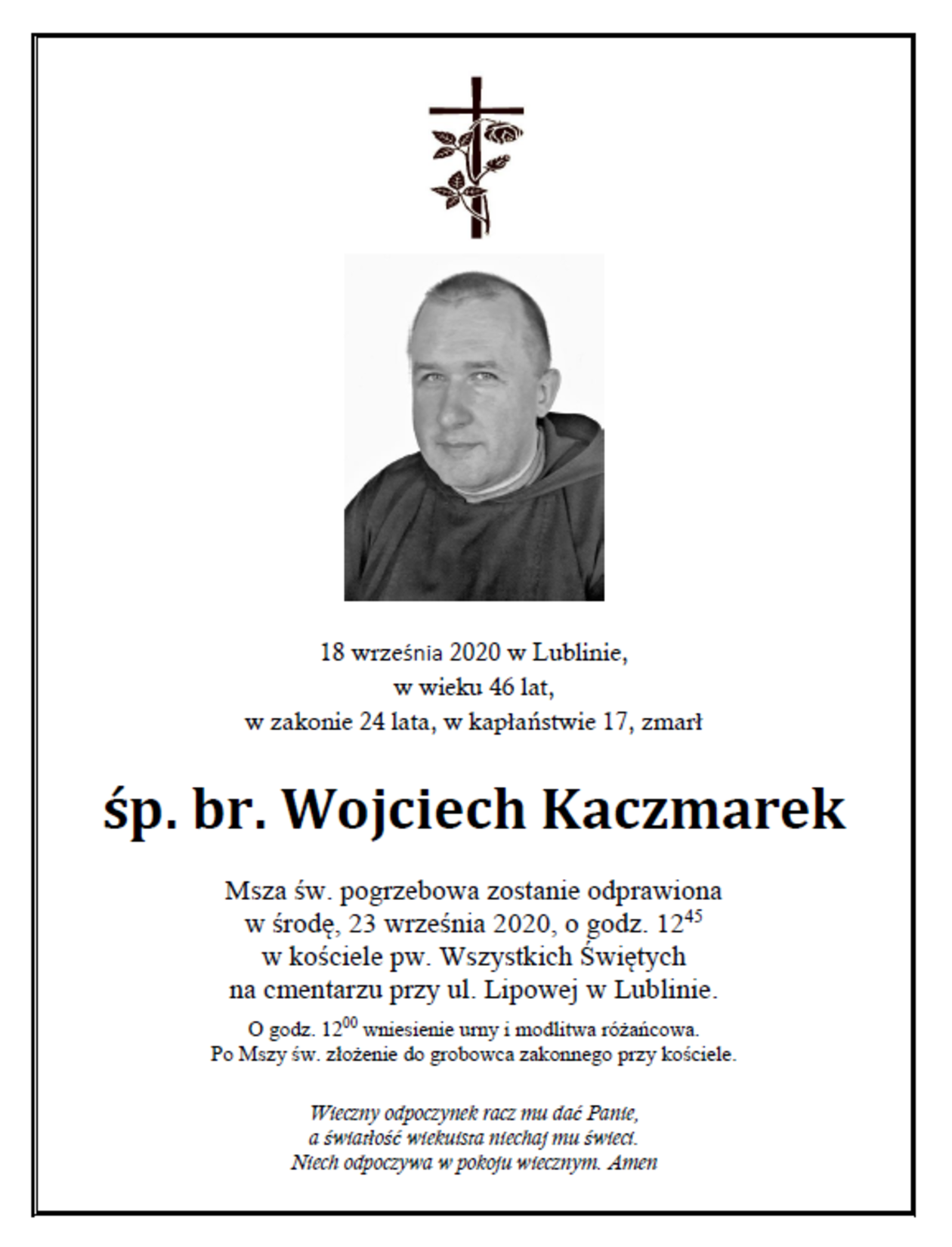 - Waszej modlitwie polecamy zmarłego dziś współbrata Wojciecha Kaczmarka, dziękujmy za jego życie i powołanie, prośmy o dar życia wiecznego – napisano na facebookowym profilu Braci Mniejszych Kapucynków – Prowincja Warszawska.