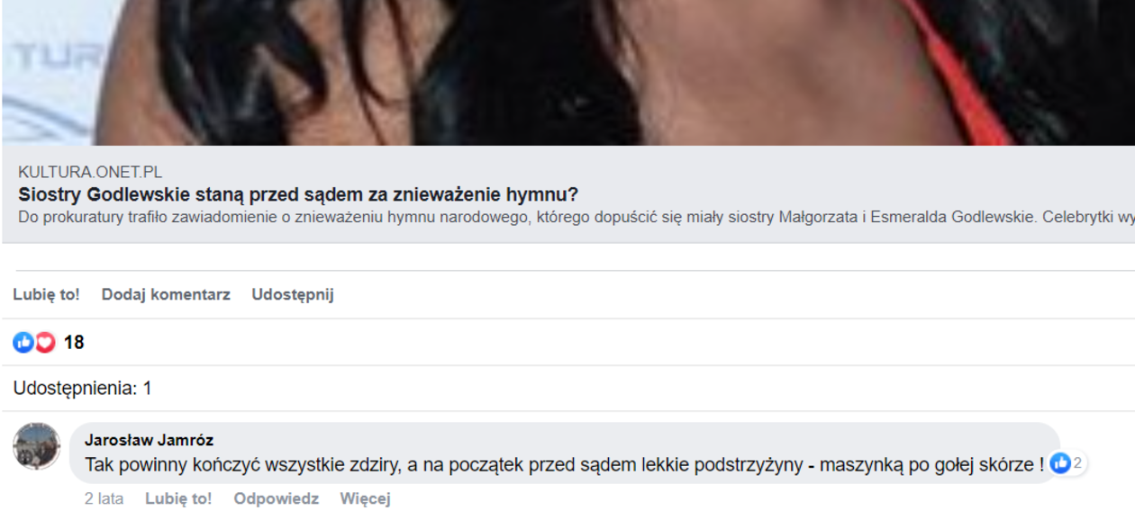 Tymczasem internauci wyciągnęli na światło dzienne kolejny komentarz Jamroza. Tym razem odniósł się do artykuły o tym, że internetowe celebrytki zaśpiewały hymn Polski. Chodziło o to, że clebrytki mogą stanąć przed sądem za znieważenie hymnu.