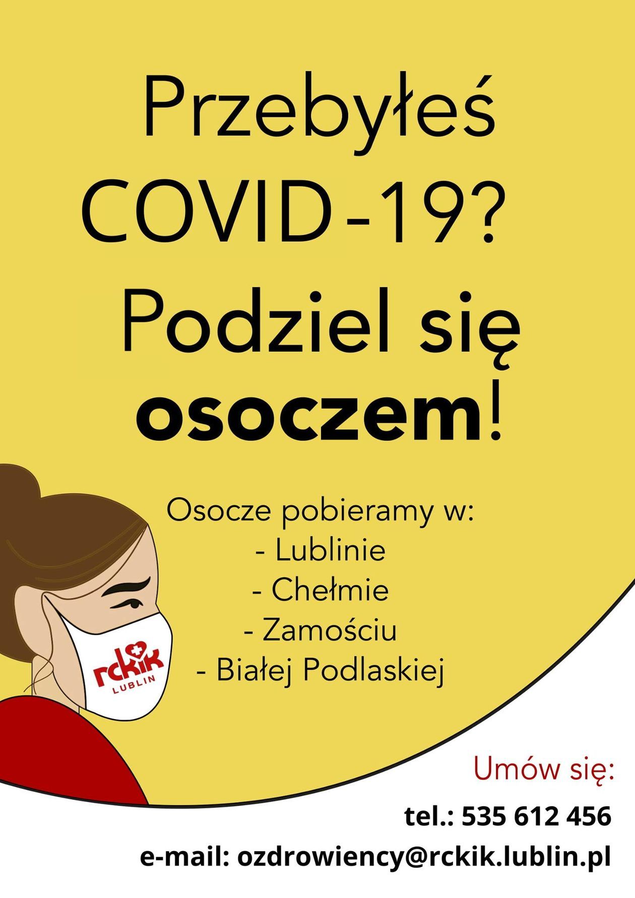Osocze jest pobierane w Lublinie, Chełmie, Zamościu i Białej Podlaskiej. Wcześniej należy zadzwonić pod numer tel. 535 612 456. E:mail: ozdrowieńcy@rckik.lublin.pl