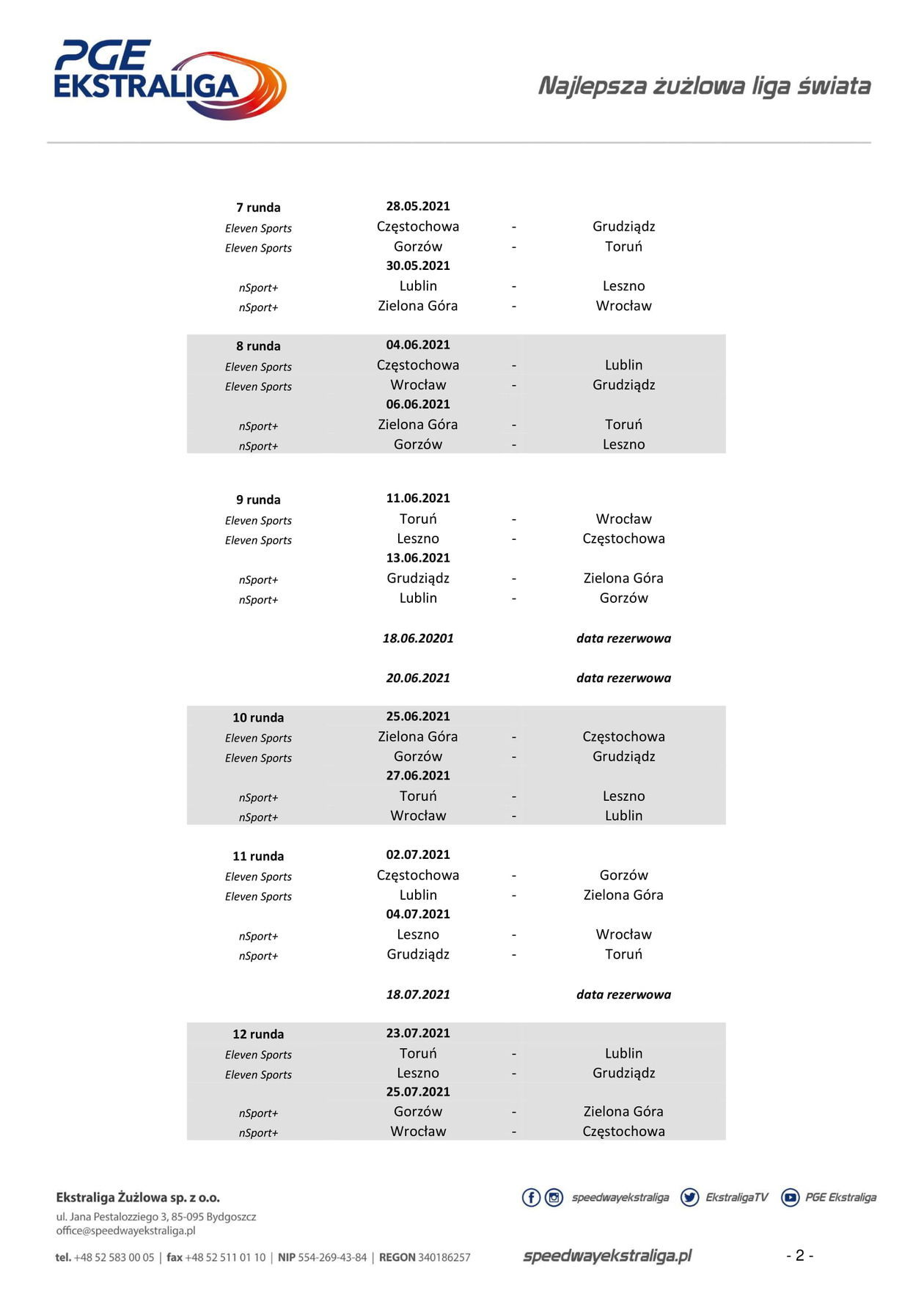 W każdej kolejce po dwa spotkania transmitowane będą na antenach nSport+ (niedzielne) oraz Eleven Sports (piątkowe).