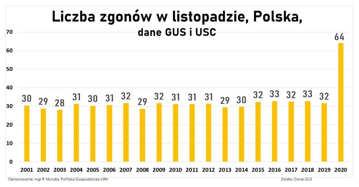 Niepokojącą tendencję dotyczącą liczby zgonów można było zauważyć już w październiku. Jak pisaliśmy, w województwie lubelskim był to wówczas wzrost o 46 proc. w porównaniu do października minionego roku (z 1870 do 2731 osób). Podobne były dane dla całego kraju. W październiku w Polsce zmarło ponad 49 tys. osób, podczas gdy w ostatnich latach średnia liczba zgonów w tym miesiącu oscylowała wokół 34 tys. (wzrost o ponad 40 proc.).