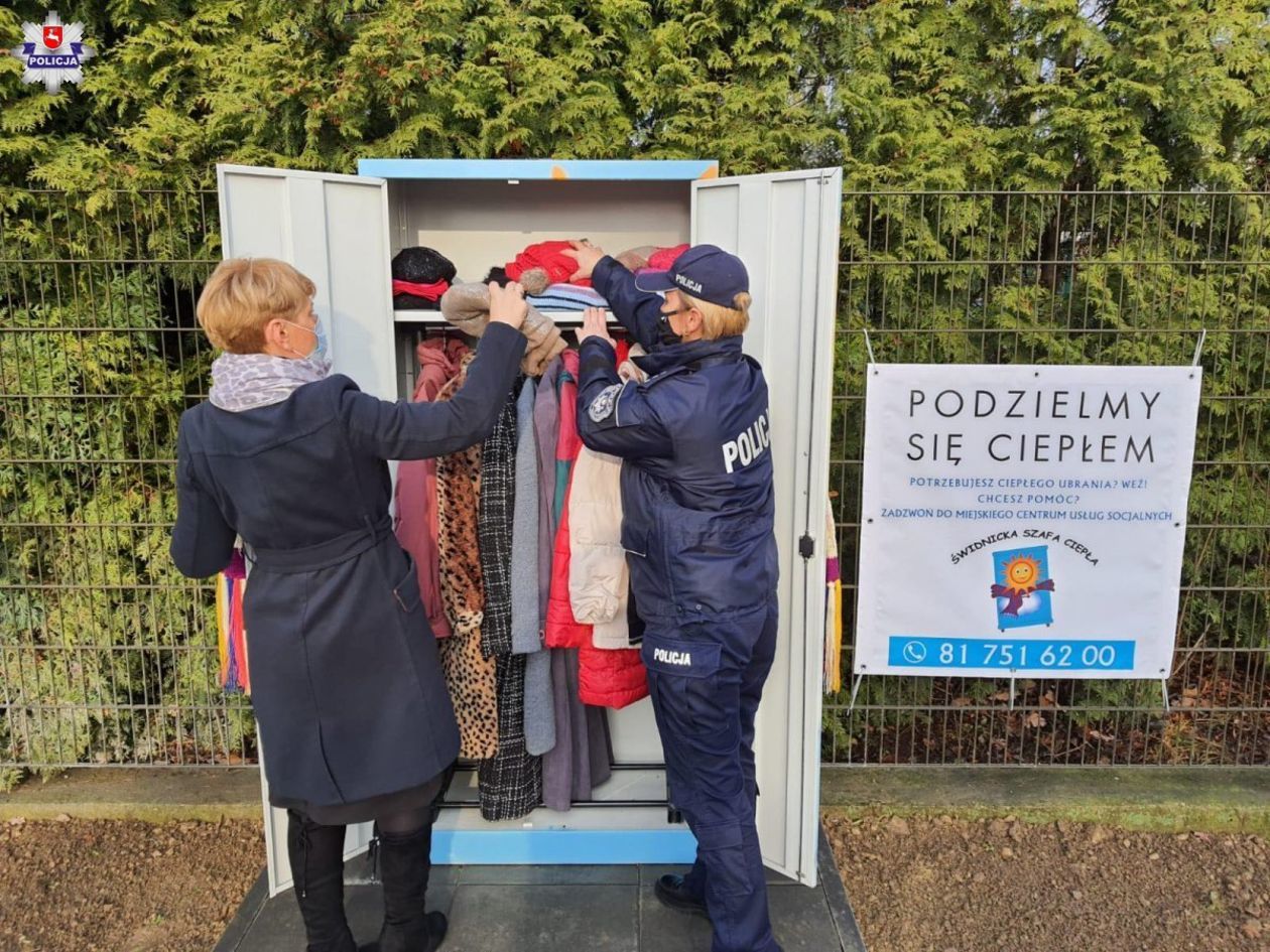 - Namalowane na niej słońce, które wymownie przekazuje, że jest to mebel, który ma za zadanie ogrzać – informuje policja i tłumaczy: - Ogrzać te osoby, które są w trudnej sytuacji i nie mogą sobie pozwolić na zakup ciepłych ubrań. Dlatego każda osoba, która jest w potrzebie może tu przyjść i wziąć dla siebie dowolną z dostępnych części garderoby.