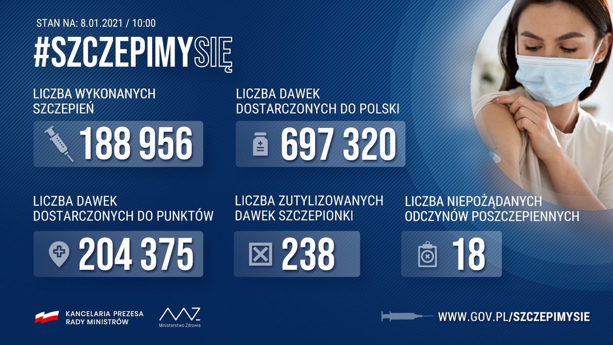 Ministerstwo Zdrowia poinformowało również o kolejnych zaszczepionych osobach - w sumie wykonano już 188 956 szczepień. Zutylizowano 238 dawek, a liczba niepożądanych odczynów poszczepiennych wynosi 18.