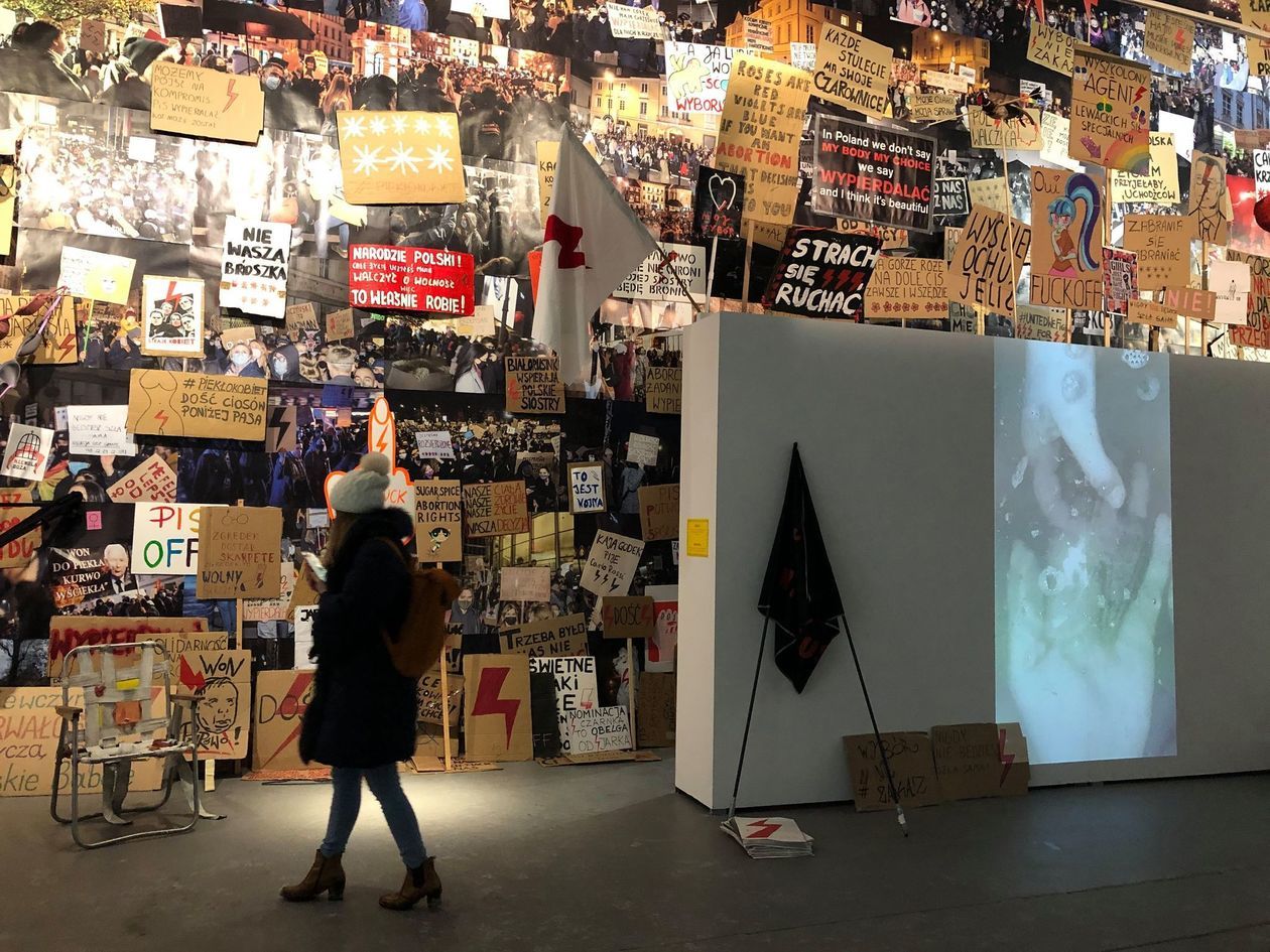 Ja tak zrobiłem i potraktowałem ją jako poboczny element znacznie ciekawszej „Nigdy nie będziesz szła sama”, która dokumentuje wielomiesięczne protesty po wyroku Trybunału Konstytucyjnego w sprawie ustawy o aborcji. Składa się na nią przede wszystkim ogromna ściana wypełniona po brzegi zdjęciami i transparentami z protestów (podobno przynosili je ludzie), której towarzyszy kilka innych elementów mocno bijących w rząd.