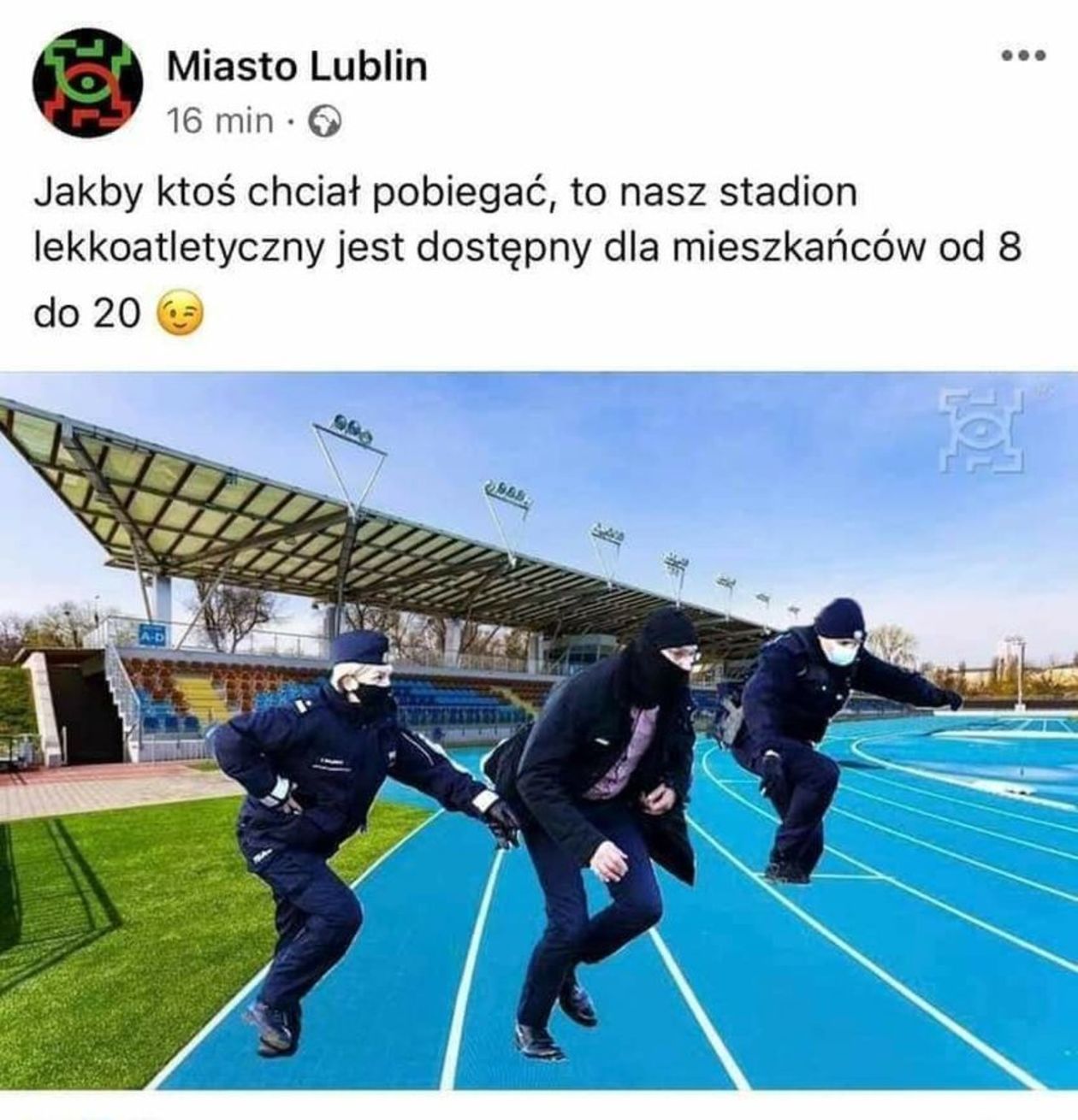 Na oficjalnym profilu „Miasto Lublin” zamieszczono fotomontaż trzech biegnących osób – dwóch policjantów ścigających zamaskowanego mężczyznę. Umieszczono ich w anturażu stadionu lekkoatletycznego w Lublinie. Mem opatrzono podpisem: Jakby ktoś chciał pobiegać, to nasz stadion lekkoatletyczny jest dostępny dla mieszkańców od 8 do 20. Prezydent Krzysztof Żuk chyba jednak ma inne poczucie humoru, bo mem szybko zniknął, a autor dostał burę od przełożonych.